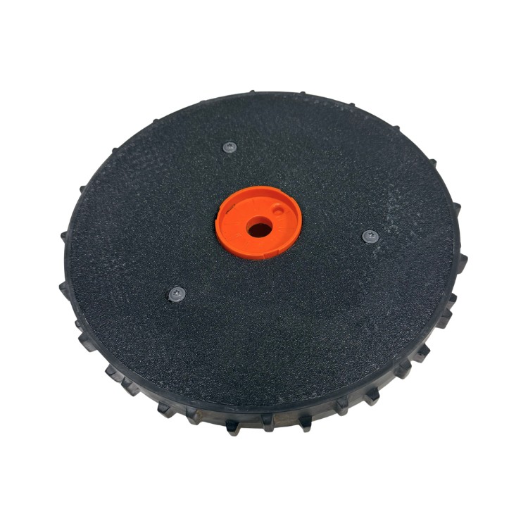 This wheel cover replaces the original inner wheel cover mounted on the inside of the drive wheel. The original part has been discontinued by Husqvarna and is no longer available, which normally forces the user to replace the entire drive wheel — even if only the cover is damaged.